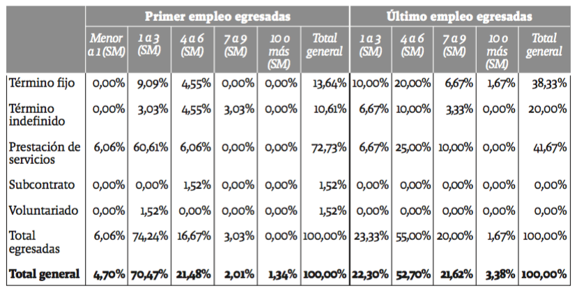 La experiencia laboral aporta a egresados y egresadas elementos de juicio para prever la cantidad de tiempo y esfuerzo requerido para la realización de ciertos productos (usualmente informes) exigidos por un contratante; esto resulta muy útil al aceptar varias contrataciones simultáneamente. Es común que deban enfrentar temporadas en las que se ven abocados a atender dos o tres compromisos laborales con distintos contratantes, para enseguida enfrentar períodos en los que no tienen empleo. Esta situación está relacionada con el predominio de las contrataciones por prestación de servicios (tablas 8 y 9).