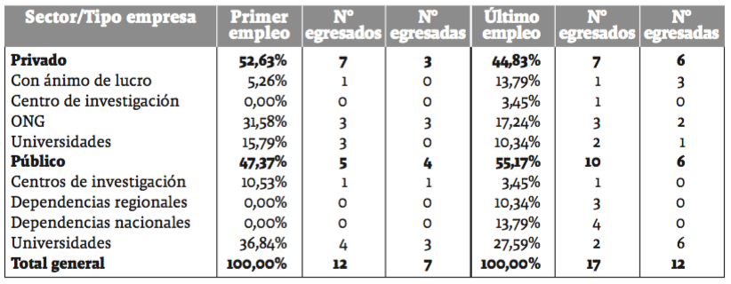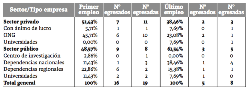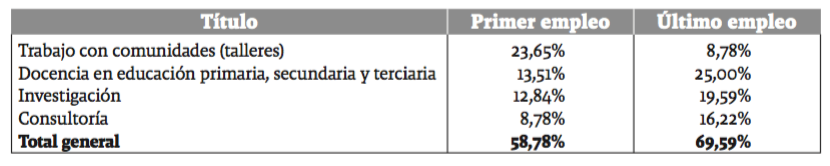 El instrumento indagó sobre dos momentos en la trayectoria de las personas encuestadas: el primer empleo tras graduarse del pregrado de sociología y el empleo actual o más reciente. Esta división responde a una perspectiva de trayectoria que intenta dar cuenta de los cambios en la situación laboral a través del tiempo (Blossfeld y Mayer 1988). Ya que la acumulación de credenciales como: títulos de posgrado, recomendaciones (contactos)8, experiencia específica certificada y mayor conocimiento del mercado laboral son elementos variables que inciden sobre la situación laboral. Adicionalmente, se realizaron doce entrevistas en profundidad9, que permitieron comprender con mayor detalle aspectos relacionados con las actividades laborales desempeñadas y las condiciones de trabajo. Con base en la información recopilada se propone una tipología sobre las alternativas laborales más frecuentemente desempeñadas por los egresados y las egresadas (trabajo con comunidades, docencia, investigación y consultoría)10.