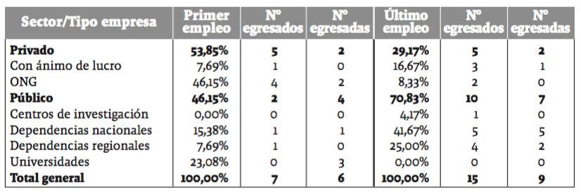 Estas condiciones hacen del trabajo con comunidades una alternativa laboral para profesionales que no acreditan estudios de posgrado. Tras la migración hacia otras actividades (tabla 3), el trabajo con comunidades se convierte en un trabajo desempeñado en dependencias nacionales16 y ONG (tabla 4) por una mayoría de mujeres sin estudios de posgrado. La proporción de mujeres pasa de 54,3% a 61,5% en el último empleo mientras los porcentajes de educación de posgrado se mantienen bajos (con maestría 23,1%, con especialización 15,4%); hecho que parece confirmar la afinidad observada por Arango (2007) entre sociólogas y acción comunitaria.