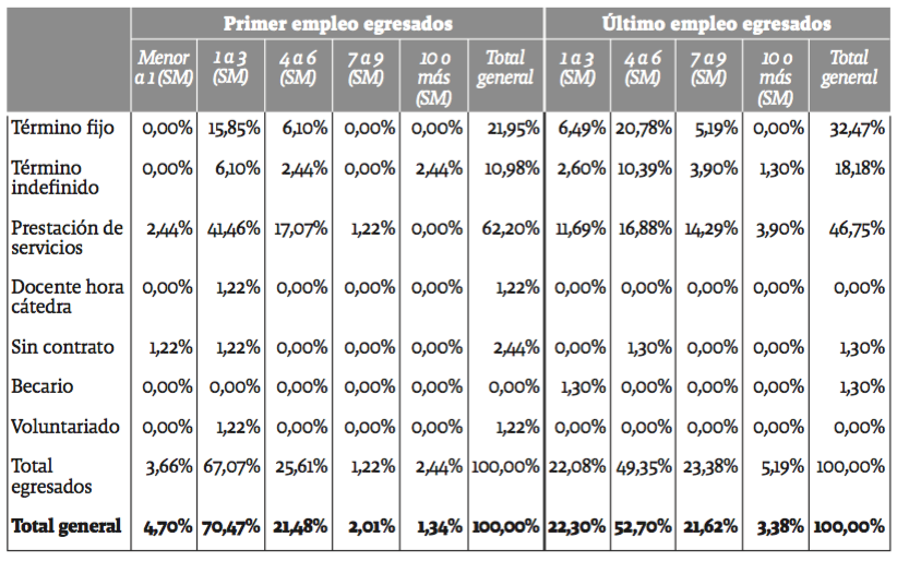Las condiciones laborales de los egresados, consideradas en términos de salario, tipo de contrato y duración de la vinculación, parecen ser —salvo ciertas excepciones— similares en los distintos tipos de actividades analizadas. El salario depende de la variación de múltiples elementos, entre los que sobresalen: la acreditación de experiencia laboral y de estudios de posgrado, así como las políticas internas de la empresa contratante. Ser contratado por una empresa es el resultado de una negociación, en ocasiones tácita, donde las partes acuerdan ciertas condiciones (Fevre 1992).