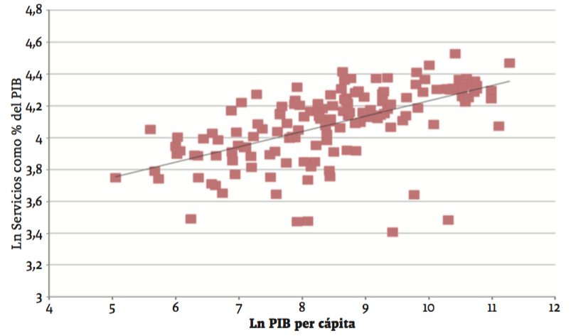 Si bien los servicios pueden ser un camino para reducir la pobreza de forma significativa, en grandes poblaciones es un tema controvertido. Algunos autores señalan que las demandas en calificación y capacidades que requieren los sectores modernos dejan de lado a las poblaciones rurales y menos calificadas; otros afirman que hay una especie de chorreo de los que trabajan en los servicios más modernos hacia el resto (Eichengreen y Gupta 2011). Hoy, uno de los grandes debates actuales en la India es la expansión en call centres y servicios similares, lo que ha sido cuestionado por el real aporte que estos tendrían en el proceso de agregar valor. De todos modos, es posible observar que la proporción de servicios en la economía es mayor a medida que aumenta el ingreso de los países (gráfico 2).