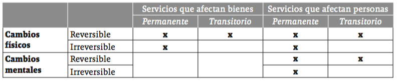 En la mayor parte de la literatura posterior, una de las definiciones más citadas es la realizada por Hill (1977), quien define los servicios como un cambio en la condición de una persona o un bien como resultado de la actividad de otra unidad económica. La distinción entre persona o bien es funcional al tipo de cambio que los servicios pueden realizar. Si bien la primera distinción entre cambios de tipo: i) permanentes o transitorios y ii) reversibles o irreversibles es aplicable a ambas categorías, se señala que mientras para los bienes los cambios son físicos, para las personas estos cambios pueden también ser mentales (tabla 1).