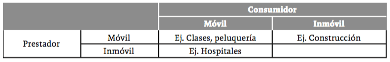 Hill sostenía que los servicios pertenecían a una lógica distinta a los bienes, particularmente por la imposibilidad de acumular inventarios; un servicio debe ser consumido cuando se produce, lo que derivaría en la necesidad de interacción entre productor y consumidor del servicio. Bhagwati (1984a) expande esta definición al notar la existencia de dos tipos de servicios: aquellos que requieren de proximidad física entre el usuario y el proveedor y aquellos donde la proximidad no es un requisito. Para los primeros propone tres categorías como muestra la tabla 2. Asimismo, explica que aquellos servicios que pueden prestarse a distancia se verán beneficiados por los avances en las tecnologías de la información (Bhagwati 1984b).