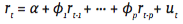 (4)La ecuación [1] corresponde a la media condicional, la cual sigue un proceso autorregresivo de orden p. Los residuales de esta ecuación son una función de gst y ut̃ , donde gst es una constante que depende del régimen (st ) en el que se encuentre la variable ut, y ũt es una variable que sigue un proceso ARCH del tipo descrito en [3]-[4], con posibles efectos de apalancamiento (leverage) medidos por la variable indicadora dt-1.