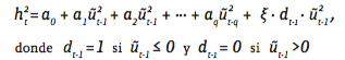Por otra parte, las ecuaciones [3] y [4] representan un proceso ARCH (q) con efecto leverage análogo al sugerido por Glosten, Jagannathan y Runkle (1993), el cual busca capturar los efectos asimétricos que los choques positivos y negativos puedan tener sobre la varianza condicional. En este documento se hará ξ=0 con el fin de concentrar el análisis en los niveles de riesgo no condicionales, sin desviar la atención sobre posibles mejoras en la estimación condicional, importantes sobre todo en el proceso de conformación de portafolios óptimos en media-varianza por parte agentes involucrados en el mercado de forma activa.