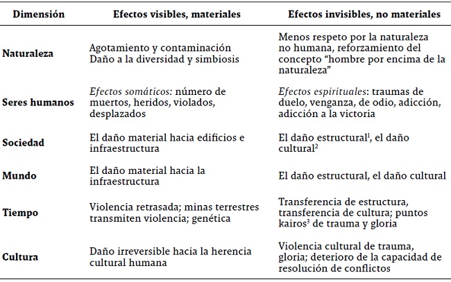 Relacionado con lo anterior, recientemente Galtung y Fischer (2013, p. 34-35) señalaron los efectos visibles e invisibles de la violencia directa en seis dimensiones que se describen en el cuadro siguiente: