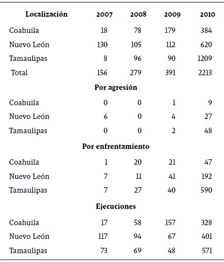 En cualquiera de las tres formas de asesinato, Tamaulipas registró los valores absolutos más altos durante 2010. No obstante, desde 2007 hasta 2009, en Nuevo León las ejecuciones fueron más elevadas; esto tal vez fue producto de un desplazamiento de los grupos en conflicto o bien, que a partir de 2010 las acciones del ejército y la marina fueron más eficientes en ese estado.