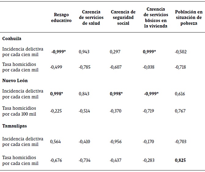 Resultados de la correlación entre condiciones socioeconómicas y criminalidad en el noreste mexicano