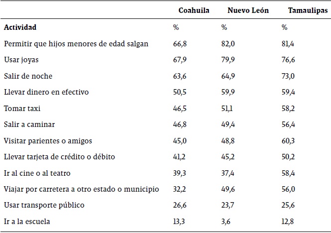 En la tabla 4 se presentan las principales actividades mencionadas por la población de la región noreste que dejaron de realizarse, y que son reflejo del cambio en sus actividades cotidianas por el aumento de la inseguridad. En primer lugar, más del 80% de la población encuestada dejó de permitir que sus hijos menores salieran solos a la calle, sobre todo en Nuevo León y Coahuila. En segundo lugar, la gente dejó de usar joyas y de salir en la noche. En general, se puede observar que de los tres estados, Tamaulipas registró mayores porcentajes de población que modificó sus hábitos de comportamiento social; además de los ya mencionados, dejaron de salir a caminar, de ir al cine o al teatro, de viajar por carretera o de visitar a parientes y amigos. Lo anterior indica la gravedad de la situación alcanzada en la región, donde los efectos de la violencia e inseguridad limitaron la libertad de la sociedad para realizar actividades cotidianas.