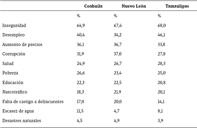 La información recabada por la Encuesta Nacional de Victimización y Percepción sobre Seguridad Publica de 2015 indica que después de vivir los años más intensos de violencia y criminalidad, una gran proporción de la población percibe que la inseguridad aún es un problema no resuelto (tabla 5). Es comprensible que a pesar de que los enfrentamientos se dieron en diferentes niveles en los tres estados, más de 64% de la población de la región considera que la inseguridad es el principal tema de preocupación. En segundo lugar, el desempleo es otro tema que preocupa en Coahuila y Tamaulipas (40,4% y 46,1% de la población encuestada así lo considera). Sin embargo, cabe resaltar el hecho de que a tres años de que se registraron altos índices delictivos atribuidos al narcotráfico, el tema en sí preocupa a solo 18,3% de la población en Coahuila, 21,9% en Nuevo León y 20,1% en Tamaulipas. Otros temas de la vida cotidiana en la región superan al narcotráfico, como los relacionados con el aumento de precios, la salud y la pobreza.