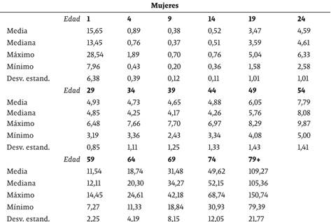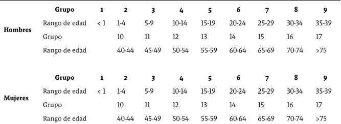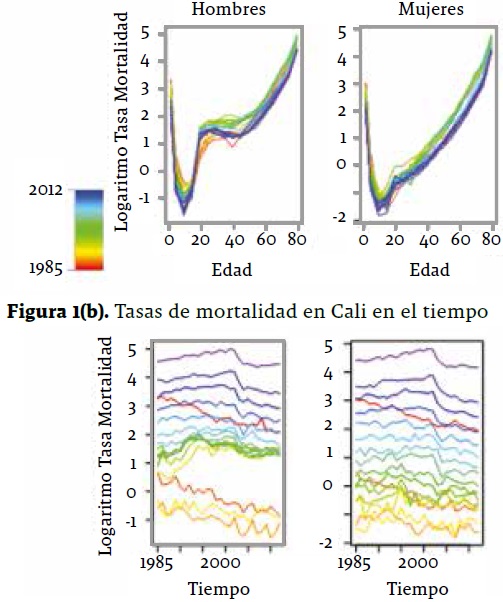 Los datos de las tasas de mortalidad por géneros y según los rangos de edad especificados en la tabla 1 se obtuvieron directamente de la Secretaría de Salud Municipal de Cali, con una frecuencia anual desde 1985 hasta 2012. En las tablas 4 y 5 de los anexos se presentan los estadísticos descriptivos asociados. Los datos disponibles presentan la limitación de que solo se encuentran discriminados por quinquenios y además es imposible estudiar la mortalidad en las edades más avanzadas, al estar agregadas todas las tasas de mortalidad después de los 79 años en una misma categoría.