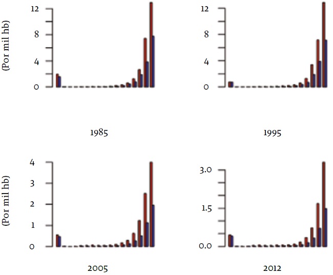 En la figura 2 se presentan las tasas de mortalidad por sexo y rangos de edad en cuatro cortes transversales de la información, para los años 1985, 1995, 2005 y 2012. Como se puede apreciar, una vez más se pone de manifiesto la reducción acentuada en todos los grupos de las tasas de mortalidad medias. No obstante, en este gráfico es más fácil ver que las reducciones no han sido proporcionales, siendo más pronunciadas para las mujeres que para los hombres. También es evidente que las reducciones en los niveles de las tasas de mortalidad son más pronunciadas en los grupos de menor edad, particularmente los menores de un año, y en los de edad más avanzada, en especial a partir de los 60 años de edad.