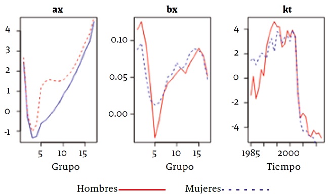 Nótese que kt es un índice dinámico, variante en el tiempo, que mide el nivel de mortalidad general. eai es la forma general de la mortalidad a través de las edades, dentro la estructura de mortalidad analizada. bi indica cuál tasa de mortalidad declina rápidamente, y cuál lo hace lentamente en respuesta a cambios en el factor k ( dln(mit )/dt=bi dk/dt ). En principio, bi podría ser negativo para algunas edades indicando que la mortalidad en esas edades podría incrementarse cuando esta cae para el resto de edades. No obstante, en la práctica este no parece ser el caso en el largo plazo, tal y como lo señalan Lee y Carter (1992) y como se puede apreciar en la sección que contiene la evidencia empírica de este documento. De hecho, solo se encuentran valores negativos de este parámetro para un grupo de edad, dentro del grupo de hombres (14-19 años), como se verá más adelante.