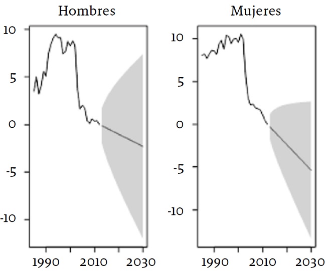 Por su parte, se tiene que la tendencia general de la mortalidad a partir de 1994 ha sido marcadamente decreciente, de lo cual da cuenta la evolución de los índices kt , para ambos sexos. Como se mencionó antes, el índice kt indica el factor común, no observable, que determina el comportamiento de las tasas de mortalidad específicas en su conjunto. Está relacionado con las posibles relaciones de cointegración del sistema y, por lo tanto, da cuenta de una relación de largo plazo entre todas las tasas de mortalidad. Como en este estudio se estimaron dos modelos, uno para hombres y otro para mujeres, se tienen dos índices kt . Ambos presentan comportamientos similares: muestran un incremento desde inicios de la muestra en 1985 hasta 1994, en el cual empiezan a reducirse. Lo anterior indica que solo a partir de ese año se presenta el patrón comúnmente encontrado en la literatura internacional de reducción continua en la tendencia común de las tasas de mortalidad, propia del avance en los estadios de desarrollo de las naciones.