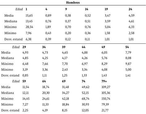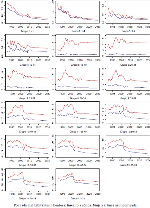 Otros patrones que surgen de la comparación sí son acordes con lo encontrado para otras regiones del mundo. Por ejemplo, la forma de “joroba” que presentan las tasas de mortalidad de los hombres a partir del grupo 1 hasta el grupo 4, y que no se presentan en las tasas de mortalidad para mujeres en los mismos rangos de edad, se asocian con un mayor número de accidentes de tráfico masculinos y homicidios en esos rangos de edad, que en el resto de la población. Por lo demás, las tasas tanto de hombres como de mujeres se reducen después del año de edad, hasta los 14, fecha a partir de la cual se incrementan sostenidamente, conforme la edad avanza.