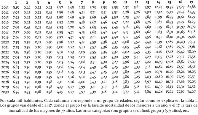 No obstante, del análisis de la tabla 2, y sobre todo de la figura 4, resalta un hecho que no constituye un patrón generalizado en el mundo, con relación al pronóstico de tasas de mortalidad, sino que más bien responde a condiciones sociales propias del Valle del Cauca, y en especial de Santiago de Cali. Esto es, las tasas de mortalidad de los hombres en los grupos 5 y 6, es decir, entre los 15 y los 19 años, y entre los 20 y 24 años de edad, no presentan signos claros de disminución en las próximas décadas y, de hecho, podrían incrementarse ligeramente. Este fenómeno está asociado, tal y como se mencionó anteriormente, con altas tasas de homicidios y accidentalidad en esos rangos de edad, para la población masculina.