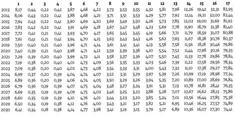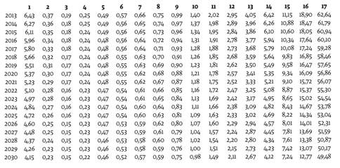 Las simulaciones proyectadas del índice kt se presentan en la figura 4. Los intervalos de confianza son muy amplios puesto que se trata de una caminata aleatoria y además son relativamente pocos los datos para Santiago de Cali, en comparación con regiones europeas o norteamericanas, que generalmente cuentan con datos en períodos de más de cien años. De ahí que se planteen en este documento los pronósticos de las tasas de mortalidad solo hasta el año 2030 (18 años desde 2012) y no a 50 años, como es habitual para naciones desarrolladas, con el fin de evitar pronósticos demasiado imprecisos.