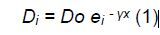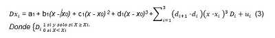 Donde Dx i es la densidad bruta de empleo, x es la distancias al CBD, x i es el valor que señala el fin del tramo i y el inicio del tramo i+1, (di+1 - di) son segmentos de igual longitud, 𝐷 𝑖 es la variable dummy igual 1 si X ≥ Xi y a 0 si X < Xi, y Ui es el termino de error.