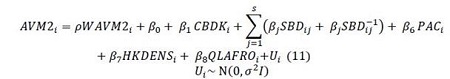 Donde 𝑊 es una matriz de contigüidad de primer orden que captura las influencias reciprocas entre las unidades espaciales, 𝜌𝑊 𝐴𝑉𝑀2 𝑖 es el retardo espacial en la variable avalúo por metro cuadrado construido en el barrio, y 𝜌 es el parámetro autorregresivo que recoge la intensidad de las interdependencias.