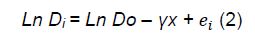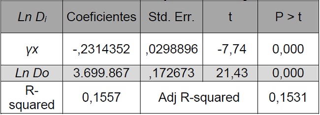 D i es la densidad de empleo neta a una distancia x del CBD, Do es la densidad teórica en la ciudad, γ es el gradiente de densidad, y ei es el termino de error. Los resultados de la estimación para Cali se muestran en la tabla 2.
