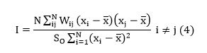 Donde 𝑥 𝑖 es el valor de la variable avaluúo por metro cuadrado construido (AVM2) analizada en el barrio i, 𝑥 es la media maestral, 𝑊 𝑖𝑗 es la matriz de pesos espaciales, N es el número de barrios, y 𝑆 𝑂 representa la suma de pesos espaciales.