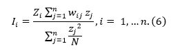 Donde 𝑍 𝑖 es el valor correspondiente al barrio i de la variable normalizada, y 𝑗 𝑖 el conjunto de barrios vecinos a i, 𝑤 𝑖𝑗 es la matriz de pesos, y N es el número de barrios.