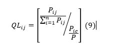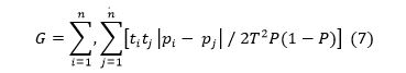 Donde ti, tj denotan la población total en la unidad espacial i e j; pi, pj, la proporción del grupo en la unidad espacial; P, la proporción del grupo en la ciudad; T, la población total en la ciudad.