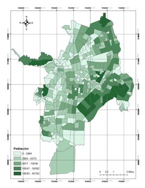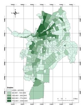 La distribución poblacional y del empleo se puede apreciar en los mapas 1 y 2, construidos a partir de la información proporcionada por la Subdirección de Catastro Municipal perteneciente al Departamento Administrativo de Hacienda Municipal (DAHM), Departamento Administrativo de Planeación Municipal (DAPM) de la ciudad y del Censo 2005 Redatam (comunas, barrios y manzanas para la variable población). Es preciso anotar qu se trabajó a nivel de sectores urbanos de la ciudad y la georreferenciación utilizó la malla urbana del DAPM con un total de 338 sectores que se asimilan a los barrios.