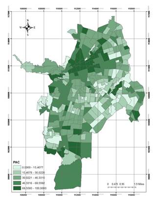El estadístico univariante de Moran para esta métrica fue de 0,573, mostrando en su distribución local la presencia de clústeres.