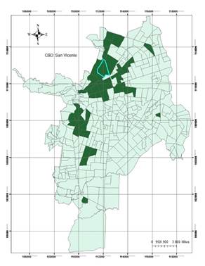 La metodología empleada sugiere que, efectivamente, el Barrio San Vicente es el candidato a distrito central, dado que en este se encuentran ubicadas alrededor de 1.683 unidades económicas que generan 23.060 empleos, los cuales representan alrededor de 7% del empleo total y la mayor densidad bruta de empleo (599 empleos por hectárea).