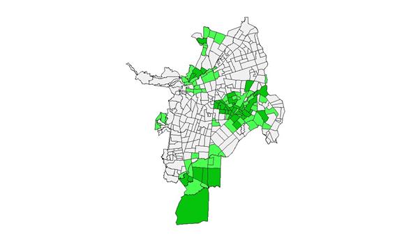 Ahora bien, ¿Qué nos enseñan las contrastaciones sobre policentrismo? De acuerdo con la metodología de Greene (1980) y McDonald (1987) en sus definiciones de subcentros de empleo, el primero define un subcentro de empleo como aquella área urbana cuya densidad bruta de empleo es el doble de la media urbana. La media urbana de densidad de empleo es de 70 empleos/hectárea. Con esta metodología se encontró que hay 37 candidatos a subcentros (mapa 5). El segundo define un subcentro de empleo como aquella zona con una densidad bruta de empleo mayor que todas las zonas contiguas, en este punto es preciso descartar los barrios aledaños al Central Business District (CBD) identificados espacialmente en el primer anillo (mapa 6), ya que forman parte del centro tradicional de Cali.