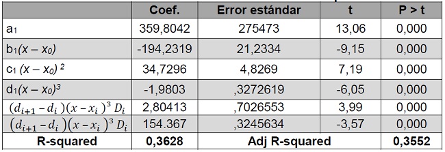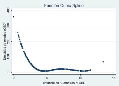 Ahora bien, un refinamiento para la identificación de subcentros estriba en la calibración de una función cubic spline dividiendo la distancia desde el CBD hacia la periferia en 5 segmentos de igual longitud. Los resultados de la estimación de esta función para 5 cortes de igual magnitud establecen que el número de cortes óptimos, utilizando el criterio del mínimo error estándar, mayor significancia de los parámetros y la bondad de ajuste del modelo es de 3. Es así que el modelo más exacto para la estimación de la función cubic spline queda expresado con la siguiente especificación: