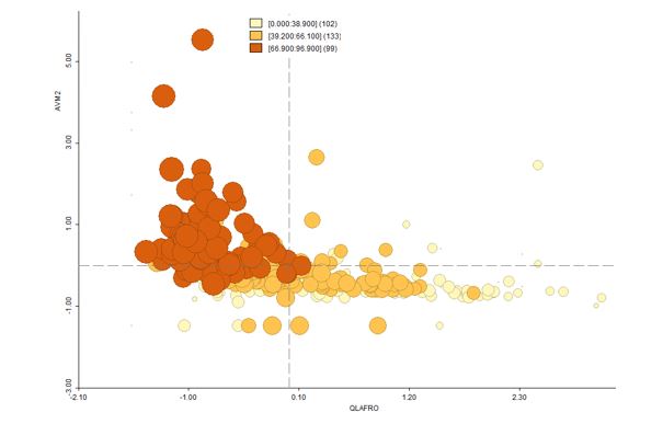 Al relacionar estos dos índices con los avalúos (gráfico 2, diagrama estandarizado de dispersión con los AVM2 en el eje vertical, el coeficiente de concentración de población afrodescendiente en el eje horizontal, QLAFRO y la intensidad de los colores denotando HKDENS) se puede ver la consistencia de las relaciones antes formuladas entre precios del suelo y segregación residencial.