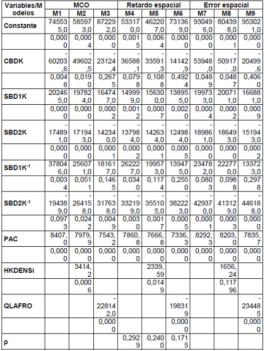Los contrastes de Moran de los residuos y los multiplicadores de Lagrange para el modelo MCO sugieren rechazar la hipótesis nula de distribución intraurbana aleatoria. Estos contrastes sugieren que el proceso generador de datos corresponde a una estructura de dependencias espaciales con un esquema autorregresivo, en la variable endógena o en el término de perturbación.