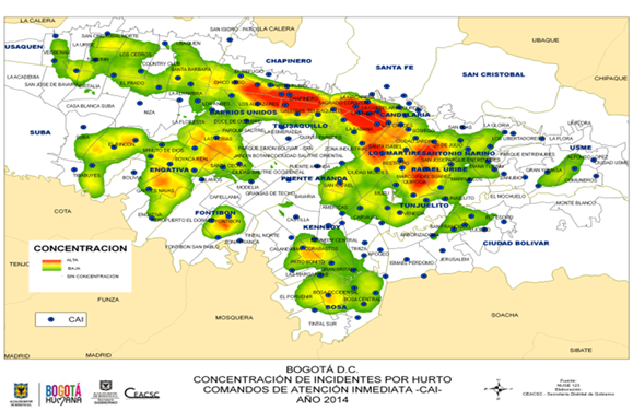 Tal tipo de cartografías oficiales de delitos de gran impacto, sin menospreciar la utilidad táctica o de posibilidades de cimentar análisis diversos14, indudablemente refuerzan este tipo de discursividades altamente reducidas y deterministas15. Por ejemplo, como se aprecia en la figura 1, los focos de alta concentración de hurto a personas en Bogotá en el 2014 coinciden espacialmente con las localidades más densamente pobladas y periféricas del sur de Bogotá16: Ciudad Bolívar, Bosa, Kennedy y Usme, las mismas que son tipificadas con los más bajos indicadores sociales de la ciudad (Avendaño, 2011).