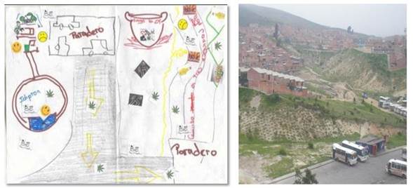 Las dos imágenes, mapa mental19 y fotografía del mismo sector de la figura 3, si bien en una escala muy detallada, dan cuenta de la pluralidad de significados que posee la inseguridad para el diseñador de esta grafía. Coexisten fobias (caritas tristes) y filias (caritas alegres), las cuales están vinculadas con las dinámicas del expendio de drogas ilegales (sustancias psicoactivas, identificadas en las hojas de marihuana y la “olla20” de la parte superior derecha), los controles territoriales de las organizaciones criminales y la ocurrencia de hechos delictivos (homicidios en las figuras negras con delineación del cadáver en línea blanca, hurtos a personas en la imagen de las figuras de nieve hurtando). Aun cuando la fotografía apenas permite visualizar un sector popular del sur de Bogotá, en la localidad de Ciudad Bolívar, ni esta ni la cartografía oficial darían cuenta de este otro tipo de dinámicas expresadas en el mapa mental. Ciertamente, tanto este mapa como los que se mostrarán a continuación integran los aspectos de esa seguridad objetiva (hecho delictivo) y subjetiva (percepción), así como el conjunto de toporrepresentaciones individuales, con impacto en lo colectivo, del grupo de significados, valores, calificativos y acepciones en torno del miedo que configuran las escalas de inseguridad urbana.