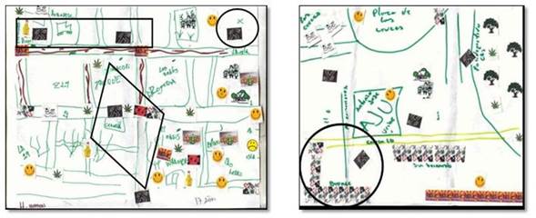 De la imagen del mapa de la derecha sobresale además la esquematización de una letra “L” construida con la imagen de venta de drogas ilegales (en un círculo negro), que en realidad corresponde a la ubicación del sector del Bronx en la carrera 15 con calle 12, el cual es identificado colectiva y públicamente como el nicho de mayor concentración de consumo y expendio de sustancias psicoactivas de Bogotá que, entre otras, es el espacio de vida de cerca de 9.000 habitantes de la calle, así como el centro de operación de las mafias dueñas de la ilegalidad de la capital. No cabe duda que si bien las imágenes de los mapas mentales también muestran ubicación de hechos delictivos como principal representación de las formas de inseguridad urbana (hurtos, homicidios, lesiones), estos son mezclados de manera enriquecida con otro tipo de toporrepresentaciones, como por ejemplo los lugares de expendio y consumo de sustancias psicoactivas (espacios públicos: parques y plazoletas), de concentración de actividades de ocio (tabernas y bares), calles oscuras y callejones cerrados (morfologías urbanas), e igualmente de sectores poblacionales (habitantes de la calle, jóvenes, agrupaciones de jóvenes fanáticos de equipos deportivos), etc. Esta es una de las potencialidades más grandes del uso de mapas mentales en relación con estudios de fenómenos de inseguridad.