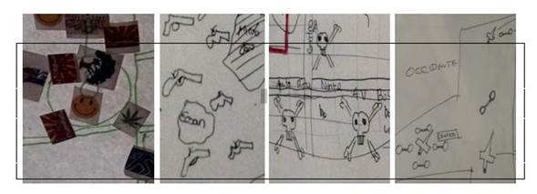 En las grafías y convenciones de ciertos mapas mentales (figura 5), se evidencia la utilización de íconos (izquierda) cuando se dispuso del gráfico de una hoja de marihuana, de un grupo de pastillas en relación con el consumo de éxtasis y de un hombre muerto para ubicar la ocurrencia de un homicidio. Algunos utilizaron directamente las palabras, es decir “inseguridad”, “miedo”, “hurtos”, términos que por estar relacionados con el concepto, sin ser un gráfico, pueden ser catalogados en el lenguaje de los íconos. Por su parte, los índices aparecen en la segunda, tercera y cuarta imágenes, con armas de fuego, dagas y calaveras respectivamente, para representar inseguridad y ocurrencia de hechos delictivos. Finalmente, los símbolos fueron utilizados para áreas peligrosas a través de “achurados” y “equis”. Este es un proceso claro de representación, pues se están sustituyendo, reemplazando y clasificando inseguridades, a través de convenciones cartográficas que, por el hecho de ser casi “personalizadas”, no limitan la interpretación de este sistema, pues en el contexto de la indagación y, a partir de los referentes culturales, el lector, el investigador o el otro habitante pueden comprender lo que el sujeto quería comunicar por medio de su mapa mental, pese a no contar con estándares, escalas o catálogos de objetos, ni contar con su presencia física en el momento del análisis.