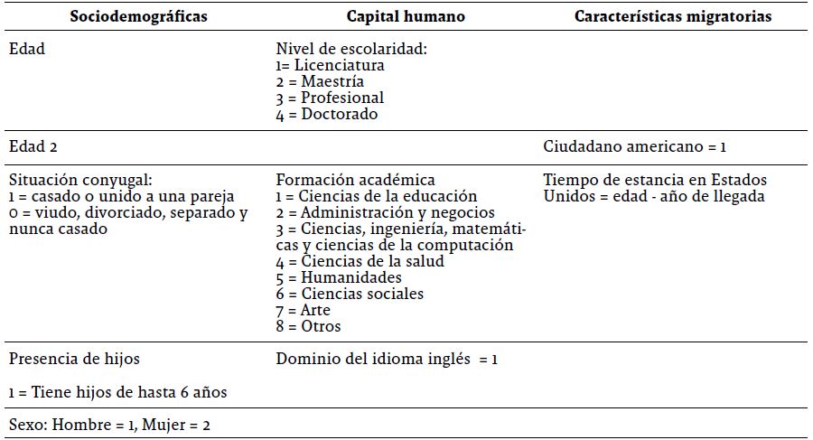 Se presenta el perfil de los migrantes con educación terciaria y que llegaron de 25 años o más a Estados Unidos. Organizamos las variables en cuatro grupos: a) sociodemográficas, b) capital humano, c) estatus migratorio y d) grupo de ocupaciones según nivel de calificación (Cuadro 1).