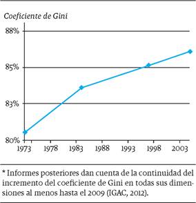 Entrada la década de 1990 la dimensión estructural de la violencia política sobre las comunidades indígenas se intensifica. La tendencia histórica a la concentración de la tierra se profundiza desde la aprobación de la Ley 160 que establece la política del mercado asistido de tierras, terminando con la intervención directa del Estado en el campo7. Si bien en el Cauca ha existido en los últimos años un aumento del número de propietarios, los predios adquiridos han sido pequeños y de mala calidad, por lo que la estructura de la propiedad agraria no se modificó sustancialmente (IGAC, 2012). Tal situación se refleja en el crecimiento sostenido del coeficiente de Gini (Figura 1) y contribuye a explicar la persistencia de la resistencia indígena.