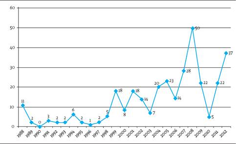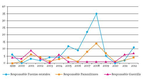 Hacia el final de los años de 1990 el conflicto armado recrudece y se redefine su lógica de funcionamiento. Los actores responsables de la violencia parainstitucional sufren transformaciones importantes: los grupos de pájaros dejan de operar como autodefensas en función de los intereses terratenientes para conformar un ejército paramilitar de carácter ofensivo al servicio de la expansión de los latifundios narcotraficantes -principalmente el Cartel de Cali- y la economía agroindustrial (Sánchez et al., 2011; Ibeas, 1995). Hacia 1997 el paramilitarismo se articula en una estructura nacional constituyendo las Autodefensas Unidas de Colombia (AUC). Los bloques Calima y Farallones de las AUC desembarcan en el Cauca donde combaten a los frentes 30 y 6 y a la columna móvil Jacobo Arenas del Comando Conjunto de Occidente de las FARC (Medina, 2011). En el marco de esta disputa territorial se producen varias masacres, como la de la hacienda El Nilo en el municipio de Caloto perpetrada por agentes de la Policía Nacional y grupos parainstitucionales (CIDH, 2000) y la masacre del Río Naya en la que el Bloque Farallones de las AUC asesina a cuarenta campesinos y produce el desplazamiento forzado de más de mil personas. La intensificación del conflicto armado desde 1999, producto en buena medida del desembarco paramilitar en el departamento, queda de manifiesto en la Figura 2.