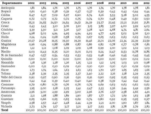 La opción por la resistencia armada por parte de las poblaciones campesino-indígenas resultará poco eficiente para defender la territorialidad comunitaria frente a la nueva dinámica del conflicto armado. A su vez, la redefinición del Estado nación colombiano, a partir de la reforma constitucional de 1991, operó como un marco de oportunidades favorable para el despliegue de una estrategia de resistencia civil al establecer un reconocimiento diferencial de las adscripciones étnicas, instaurando derechos y recursos específicos. La constitución colombiana de 1991 afirma el carácter multicultural de la sociedad e incorpora nuevos derechos, tales como el derecho consuetudinario, el derecho a la propiedad colectiva, el derecho a la educación bilingüe, el carácter oficial de las lenguas indígenas en sus territorios y las autonomías territoriales en el ámbito municipal. En el nuevo escenario de gestión estatal de la diversidad los pueblos indígenas aparecen dotados de recursos financieros mediante la transferencia directa de recursos a los cabildos. Los cabildos indígenas en 1994 reciben $4858 millones mientras que en 2012 esa suma asciende a $133.305 millones. Desde 1994 hasta el 2010 el Cauca es el departamento que recibe mayores ingresos, superando porcentualmente su proporción poblacional: según los datos censales del 2005 en el Cauca habita 17,85% de la población indígena nacional, pero sus resguardos reciben en ese año 24,54% de los ingresos territoriales (Tabla 1).
