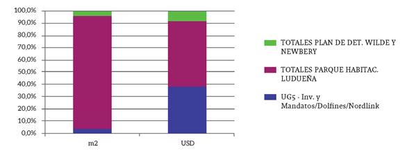 En lo que se refiere a Puerto Norte, mientras las UG2/2, UG4 y UG6 invierten en mayor proporción en compensación por mayor aprovechamiento urbanístico, las UG5 y UG2/1 implican una mayor proporción de ingreso de tierras o al Fondo Municipal de Tierras (y en el caso de la UG2/1 también una proporción de ejecución de infraestructura algo superior al promedio). Palos Verdes implicaría una ejecución de infraestructura algo mayor a la media, compensada con un menor ingreso de tierras.