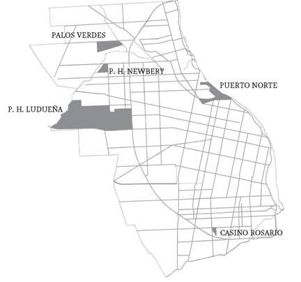 La investigación se centra en los cinco proyectos urbanos más importantes que se han desarrollado en la última década (Plano 1): tres nuevas urbanizaciones residenciales al noroeste de la ciudad (Ludueña, Newbery y Palos Verdes); y dos proyectos de reconversión urbana: uno residencial y comercial en el centro sobre la costa (Puerto Norte) y uno al sur netamente comercial (Casino Rosario S. A.).