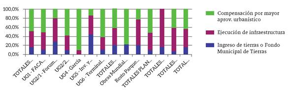En función del Gráfico 4 se puede apreciar una estructura promedio de alrededor de un 15% de la inversión privada destinada al ingreso de tierras o al Fondo municipal de tierras, un 40% destinado a ejecución de infraestructura y un 45% en concepto de compensación por mayor aprovechamiento urbanístico.