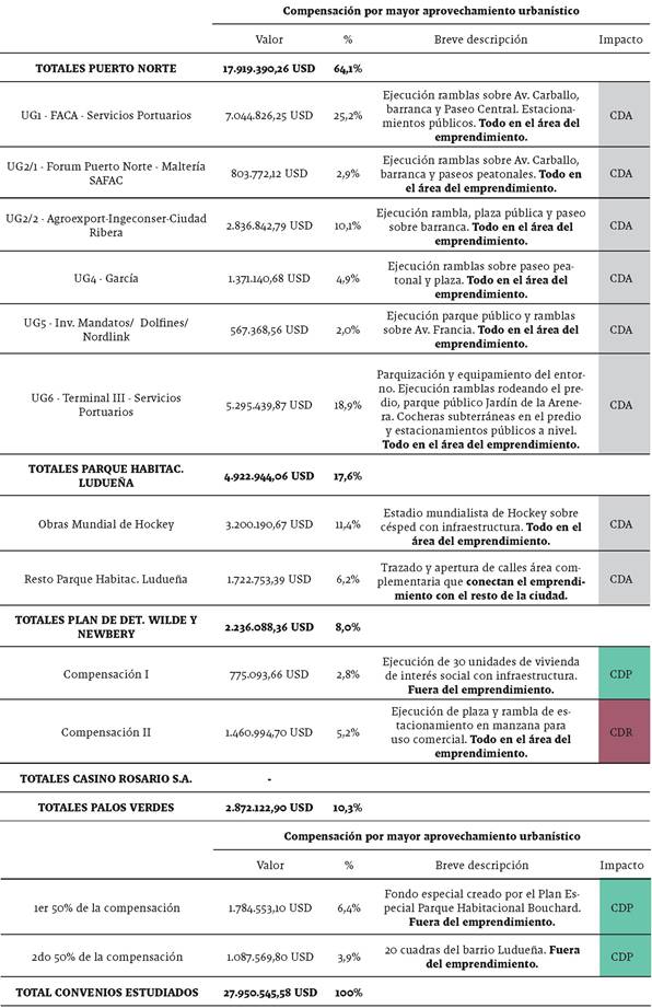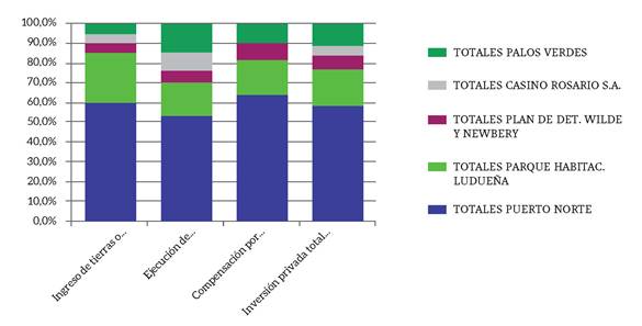 En lo que respecta la ejecución de infraestructura, Puerto Norte congrega 52,8% de la misma (y en particular la UG1, 21,5%), el Parque Habitacional Ludueña 16,7%, Palos Verdes 13,9% y el Casino Rosario SA 10%. Por otra parte, 64,1% de las compensaciones por mayor aprovechamiento urbanístico provendría de Puerto Norte y en especial las UG1 y 6 que sumarían 44,2% del total. En este caso también sería importante el aporte del Parque Habitacional Ludueña, y en especial el Estadio mundialista de Hockey (11,4% del total de las compensaciones por mayor aprovechamiento urbanístico).