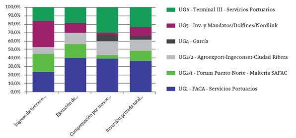 La UG1 y UG6 representan 60,9% de la inversión privada, 58,9% de la ejecución de infraestructura y 68,9% de las compensaciones por mayor aprovechamiento urbanístico en Puerto Norte (Gráfico 6). Por su parte, la UG5 es la que implicaría una mayor inversión destinada al ingreso de tierras o al Fondo Municipal de Tierras.