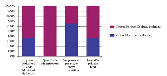 En lo que refiere a la inversión privada en el Parque Habitacional Ludueña (Gráfico 7), mientras el Estadio mundialista de Hockey representó 65% de la compensación por mayor aprovechamiento urbanístico dentro de dicho convenio, el resto del Parque Habitacional Ludueña va a implicar el 100% de la ejecución de infraestructura y 63,5% del ingreso de tierras al Fondo Municipal de Tierras.