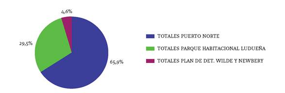 Por escala y por su característica de representar un agregado de convenios urbanísticos, se destaca Puerto Norte que implicó compensaciones por mayor aprovechamiento urbanístico de casi USD$18 millones y representa 58,9% de la inversión privada movilizada a través de estos convenios urbanísticos. Lo siguen en envergadura el Parque Habitacional Ludueña que representaría 18,6% de la inversión privada (6,6% destinada al Estadio mundialista de Hockey) y Palos Verdes con 11% de la inversión privada acordada (Gráfico 5).
