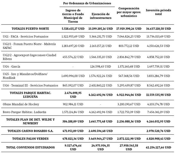 La municipalidad de Rosario emplea los “convenios urbanísticos” como una herramienta para hacer operativas las distintas intervenciones en los grandes proyectos y obtener recursos propios. Dichos acuerdos desarrollados permitieron ampliar la cantidad de obras públicas realizadas y hacer frente a algunas demandas vinculadas a la vivienda social y equipamiento. Sin embargo, la inversión privada total provista en estos convenios urbanísticos no supera el gasto de la Secretaría de Obras Públicas municipal en un período fiscal, y a su vez representa alrededor de 15% de los recursos de origen municipal en dicho período fiscal.